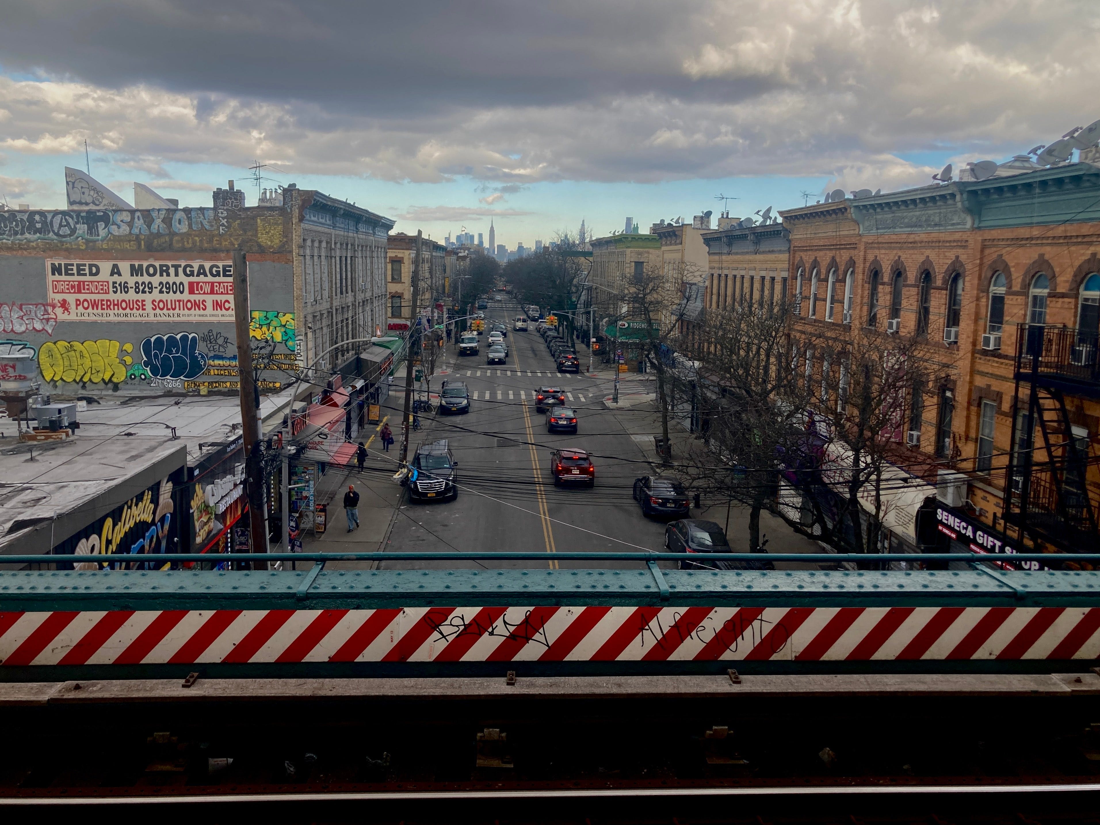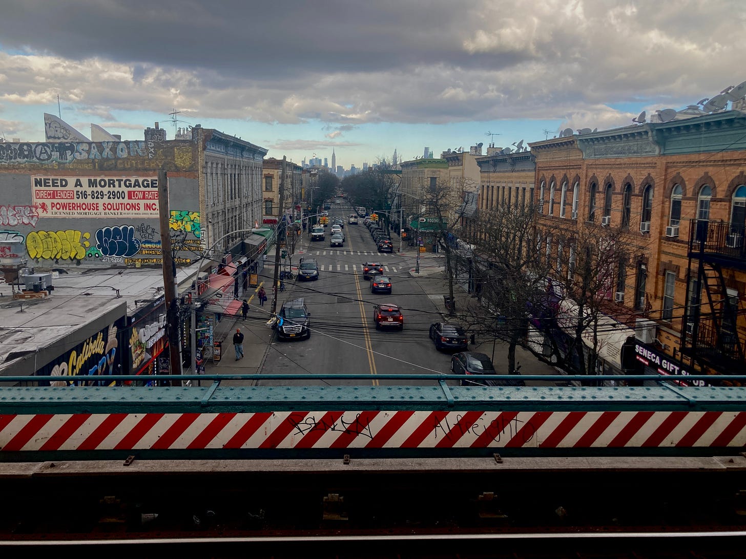 Running above-ground toward Manhattan, the M offers a view of an imposing skyline, which grows steadily as we chug along. We head west through Brooklyn, joined by more serious people along the way. Men with still-wet hair hastily slicked to the side who wear black shoes with buckles take their seats next to women sporting scarves and over-ear headphones.